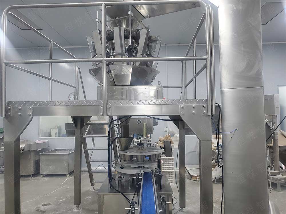 ②Z型上料機(jī)或斗式上料機(jī)自動(dòng)上料,多頭組合秤將在灌裝填充前自動(dòng)計(jì)量稱(chēng)重并投放物料